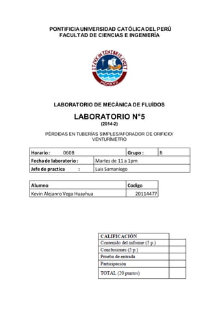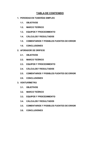 Este documento presenta los resultados de tres experimentos realizados en un laboratorio de mecánica de fluidos: 1) medición de pérdidas de carga en tuberías simples de diferentes materiales, 2) uso de un aforador de orificio, y 3) uso de un venturímetro. Los estudiantes midieron caudales, velocidades de flujo, pérdidas de carga, coeficientes de fricción y rugosidades para diferentes tuberías. Los cálculos incluyeron ecuaciones de Darcy-Weisbach, Colebrook-White y Barr para estimar la
