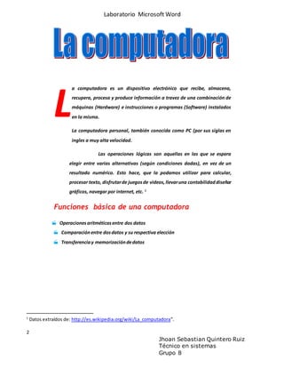 El documento proporciona información sobre las funciones y características de un procesador de texto. Explica que un procesador de texto permite crear y modificar documentos de forma más potente y versátil que una máquina de escribir tradicional, y ofrece funciones como formato de texto, inserción de imágenes, guardado de archivos y corrección ortográfica.