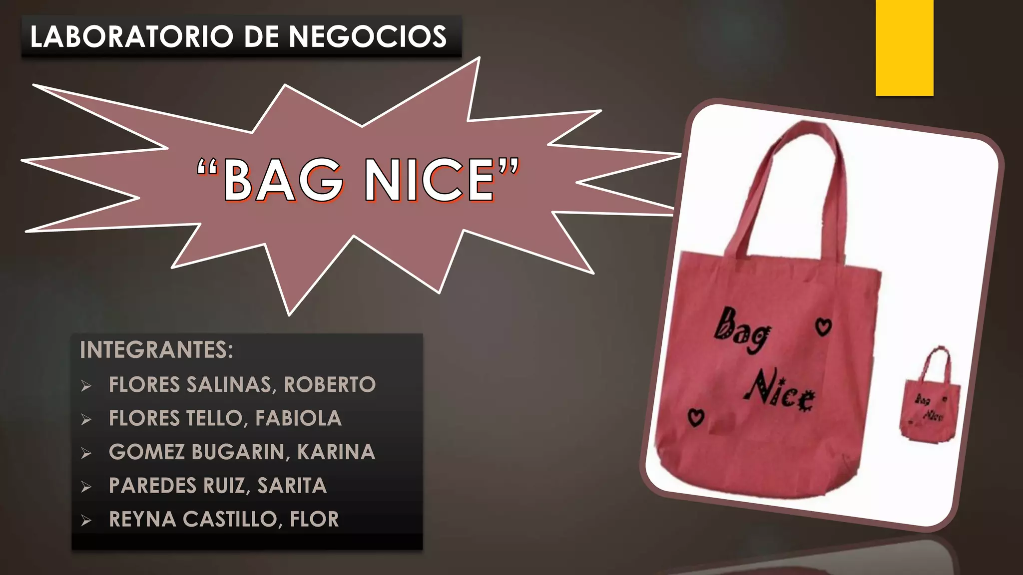 Este documento presenta un plan de negocios para una tienda de bolsos llamada "BAG NICE". Incluye la estructura organizacional, los productos, precios, inversiones requeridas, costos, análisis financiero y estrategias de promoción. El objetivo es convertirse en una de las mejores empresas de bolsos con bordados hechos a mano en el Perú para el 2020.