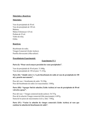 El documento describe dos experimentos químicos que demuestran la ley de conservación de la materia. En el primer experimento, se pesan los reactivos de bicarbonato de sodio y ácido acético antes y después de la reacción, mostrando que la suma de sus masas es igual a la masa del producto formado. En el segundo experimento, se usa una pastilla efervescente en agua dentro de un globo, y también se muestra que la suma de las masas de los reactivos es igual a la masa final después de la reacción. Ambos experiment