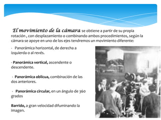 El documento describe diferentes tipos de movimientos de cámara, incluyendo panorámicas, travellings, y movimientos de grúa. También explica cómo el movimiento puede tener funciones descriptivas o dramáticas. Luego, describe formas en que el tiempo puede ser manipulado en el cine, como condensación, distensión, continuidad, flashbacks, y elipsis.