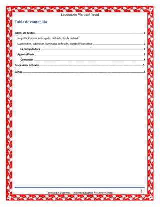 El documento presenta una guía sobre el uso de diferentes funciones y herramientas en Microsoft Word como estilos de texto, agenda diaria, comandos básicos, cartas y más. Explica cómo aplicar formatos como negrilla, cursiva y subrayado, e incluye ejemplos de tablas, listas y secciones sobre procesadores de texto y su función.
