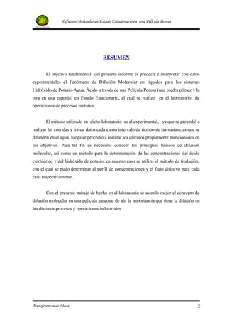 Este documento describe un experimento para predecir e interpretar la difusión molecular en estado estacionario a través de películas porosas en líquidos. Se estudió la difusión del hidróxido de potasio en agua a través de dos películas porosas, una de piedra pómez y otra de esponja. El método experimental involucró tomar muestras periódicas para determinar las concentraciones y calcular el flujo difusivo. Los resultados permitieron determinar el perfil de concentraciones y la difusividad efectiva de