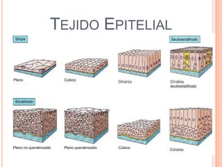 Este documento resume los principales tipos de tejidos en el cuerpo humano, incluyendo tejido epitelial, conectivo, cartilaginoso, óseo y muscular. Describe la estructura y función de cada tejido y proporciona ejemplos de muestras histológicas como riñón, piel e intestino delgado.