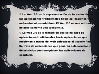 La Web 2.0 se refiere a la evolución de las aplicaciones tradicionales a aplicaciones web enfocadas en el usuario final, que fomentan la colaboración y reemplazan las aplicaciones de escritorio. Las herramientas Web 2.0 como blogs, microblogging y redes sociales permiten a los usuarios crear y compartir información e interacciones en línea.