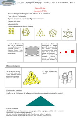 Este documento presenta un proyecto de reingeniería pedagógica sobre números configurados. El objetivo es que los estudiantes comprendan y construyan configuraciones numéricas usando recursos didácticos como números figurados, pensamiento espacial, geométrico y percepción mental. Incluye ejercicios como identificar números figurados, expresar la cantidad de cubos necesarios para torres de diferentes alturas, y dibujar un rostro visualizado.