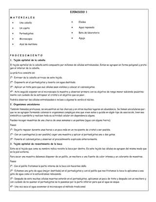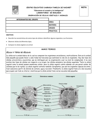 Este documento presenta un marco teórico y una práctica de laboratorio para observar diferentes tipos de células vegetales y animales utilizando un microscopio. Se describen cuatro ejercicios para observar tejido epitelial de cebolla, organismos unicelulares, tejido epitelial de la boca y células de elodea. El objetivo es describir las características de las células, identificar sus organelos y comparar las células vegetales y animales.