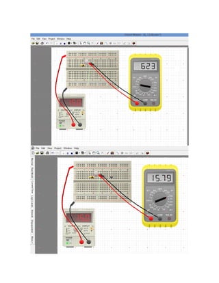 Este documento presenta un informe de laboratorio sobre la ley de Ohm. Explica cómo calcular la corriente y el voltaje en un circuito usando la ley de Ohm, y cómo medir la corriente y el voltaje en un circuito real utilizando CircuitWizard. El documento incluye tablas para registrar los resultados de los cálculos y las mediciones.