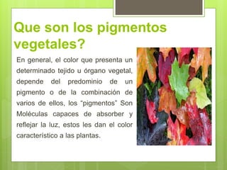 Los pigmentos vegetales como la clorofila, carotenos y xantofilas dan color a las plantas al absorber y reflejar la luz. Estos pigmentos se pueden separar usando cromatografía y su espectro de absorción se puede medir con un espectrofotómetro para determinar en qué rango de longitudes de onda absorben mejor la luz.