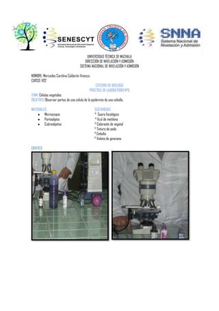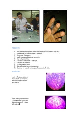Este documento describe un experimento de laboratorio para observar células vegetales de una cebolla usando un microscopio. El procedimiento involucra extraer la epidermis de una cebolla, colocarla en un portaobjetos con colorante y observarla a través de un microscopio a aumentos de 4x, 10x y 40x. Las observaciones muestran las características de la célula de la epidermis a diferentes aumentos. El objetivo era observar partes de la célula vegetal y aprender sobre el uso del microscopio.