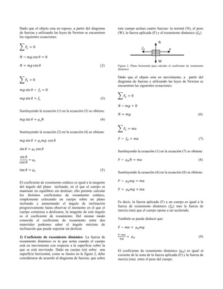 Este documento presenta instrucciones para calcular el coeficiente de rozamiento estático y dinámico entre dos superficies mediante experimentos con materiales como madera, gamuza y acrílico. Se explican las leyes de Newton y cómo usar un plano inclinado para medir el coeficiente estático, el cual es mayor que el dinámico. Los resultados muestran que el coeficiente estático entre madera y madera es 0.56, entre madera y gamuza es 0.46, y entre madera y acrílico es 0.51.