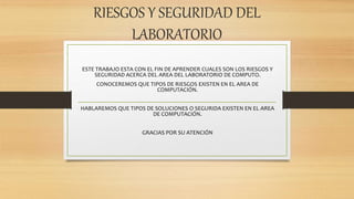 El documento aborda la importancia de la seguridad en el laboratorio de computación, destacando los riesgos como las descargas electrostáticas (ESD) y la necesidad de medidas de prevención como el uso de extintores y herramientas específicas. Se menciona OHSAS 18001 como un estándar para mejorar la seguridad y salud en el trabajo. Además, se enfatiza en el uso de equipos de protección y prácticas seguras durante el mantenimiento de computadoras.