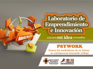 PsyWork es una empresa dedicada a la búsqueda de empleo para psicólogos, conectando a profesionales recién egresados con empresas e individuos que requieran sus servicios. Su visión es ser reconocida como una operadora líder de talento humano especializado en psicología, brindando soluciones integrales a sus clientes. La empresa busca satisfacer las necesidades de empleo de psicólogos y de contratación para empresas y personas, invirtiendo inicialmente 11.8 millones de pesos.