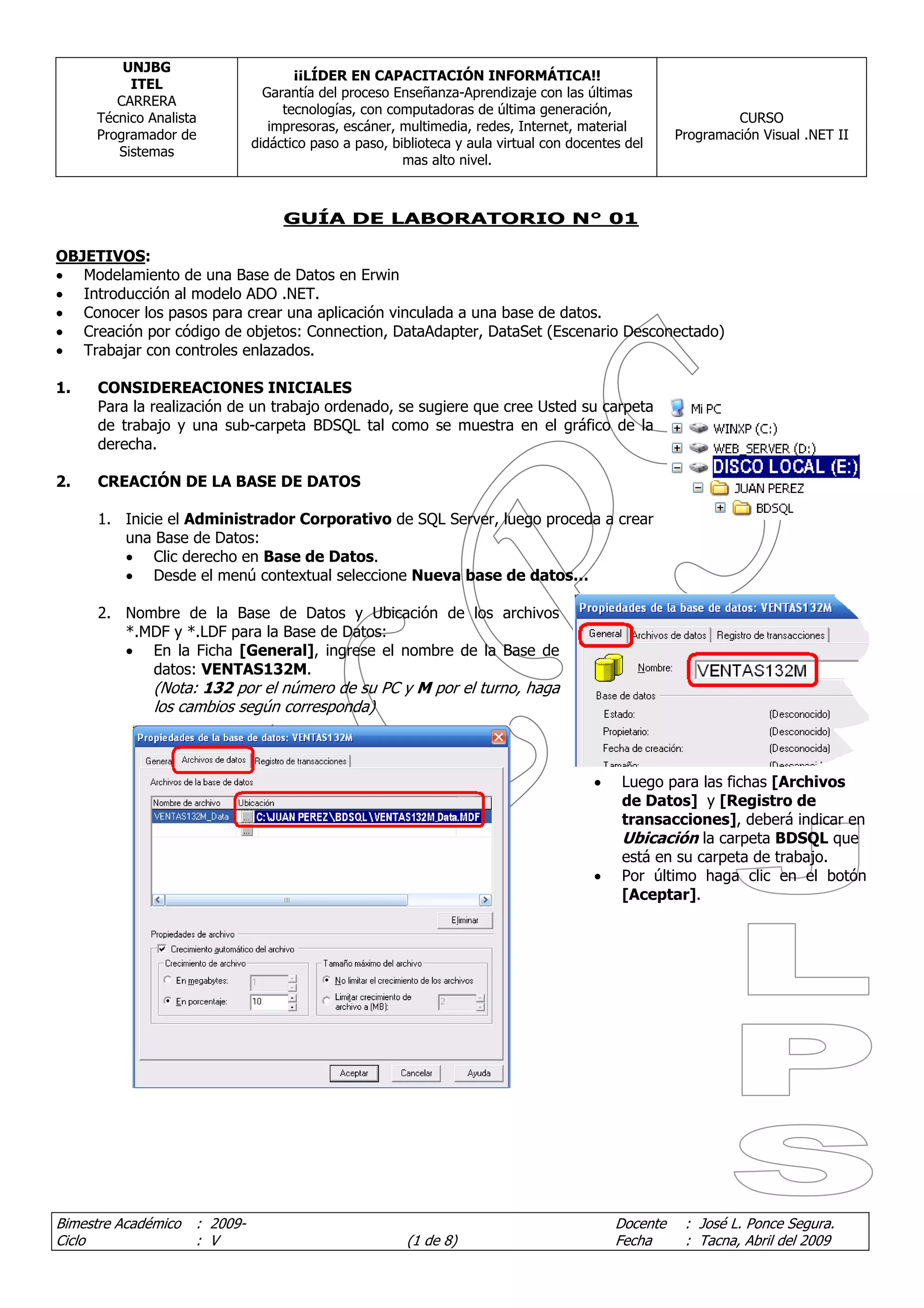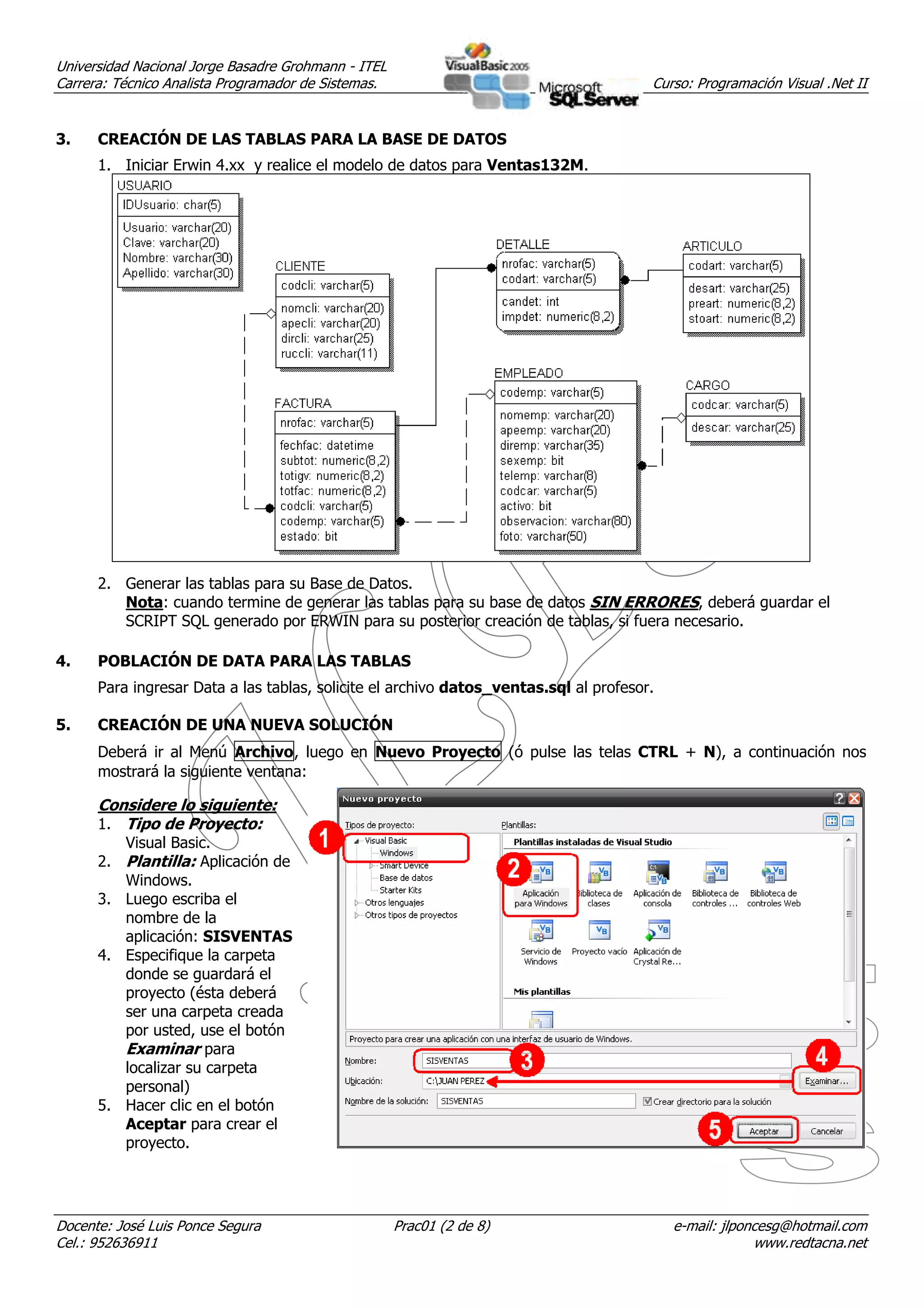 El documento presenta una guía de laboratorio sobre programación visual .NET. Explica cómo crear una base de datos en SQL Server, modelarla en Erwin y generar tablas. Luego indica cómo crear una solución en Visual Studio vinculada a la base de datos mediante ADO.NET, estableciendo una conexión y utilizando objetos como DataAdapter y DataSet para extraer y modificar datos de forma desconectada. Finalmente, muestra cómo visualizar los datos de una tabla enlazando controles a un conjunto de datos.