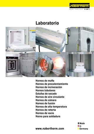 Este documento presenta una variedad de hornos industriales fabricados por Nabertherm, incluyendo hornos de mufla, hornos de precalentamiento, hornos de incineración, hornos tubulares, estufas de secado, hornos de aire circulante, hornos de cámara, hornos de alta temperatura, hornos de retorta y hornos para soldadura. Nabertherm ha estado diseñando y produciendo hornos industriales durante más de 60 años y ofrece la gama más amplia de hornos del mundo.