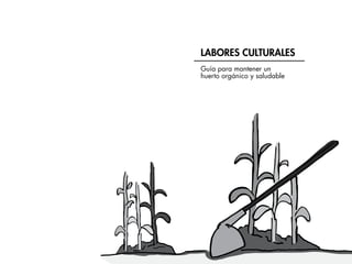 Este documento presenta una guía para realizar las principales labores culturales necesarias para mantener un huerto orgánico y saludable. Describe labores como el trasplante, raleo, riego, aporque, repique, deshierbe y podas, explicando cuándo y cómo realizar cada una para optimizar el crecimiento de las plantas y la producción del huerto. La guía fue escrita por la Fundación Alternativas de Bolivia con el objetivo de garantizar la seguridad alimentaria a través de propuestas sostenibles.