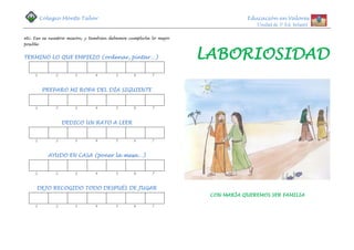 El documento habla sobre la importancia de la laboriosidad y el esfuerzo en el trabajo. Resalta la necesidad de enseñar a los niños a valorar el esfuerzo y la satisfacción de completar una tarea. Aconseja motivar a los niños a terminar lo que empiezan, felicitarlos por su trabajo duro y darles responsabilidades en el hogar para que desarrollen la iniciativa.