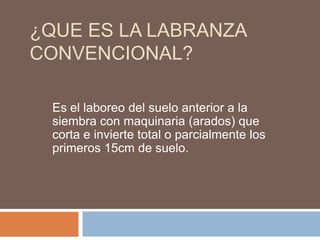La labranza convencional implica el laboreo del suelo con maquinaria como arados que cortan e invierten parcialmente los primeros 15 cm del suelo. Tiene ventajas como eliminar malezas y plagas, pero también desventajas como dejar el suelo expuesto a la erosión y compactarlo. La maquinaria común incluye rastras, arados de vertedera y de discos, los cuales preparan el suelo de diferentes formas. El rotavitor es una herramienta que incorpora, pica y subsuela el suelo en un solo paso.