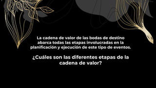 El documento describe la cadena de valor de las bodas de destino, incluyendo etapas como la planificación, alojamiento, diseño y coordinación del evento. Explica que las bodas de destino generan beneficios económicos para las comunidades locales a través de ingresos, empleos e impulsos al turismo. También promueven la cultura local y requieren una gestión sostenible y responsable de los recursos. Diversos actores como organizadores, destinos, parejas y proveedores desempeñan roles en crear experiencias de bodas exit