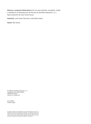 Este documento contiene 47 fichas de refuerzo y ampliación de Matemáticas para tercer curso de Primaria. Las fichas cubren una variedad de temas matemáticos como números naturales, operaciones básicas, geometría, medición y resolución de problemas. También incluye soluciones al final.