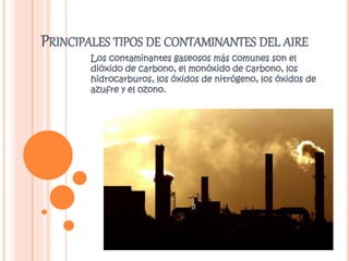 La contaminación del aire se define como la presencia de sustancias en la atmósfera que pueden causar molestias o riesgos a la salud. Los principales contaminantes gaseosos son el dióxido de carbono, monóxido de carbono, hidrocarburos, óxidos de nitrógeno, óxidos de azufre y ozono. Estos gases afectan el clima y la capa de ozono, y pueden causar problemas respiratorios y cardíacos en humanos. Para reducir la contaminación, se recomienda usar transporte públic