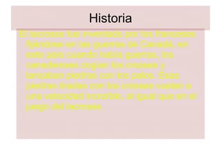El lacrosse es un deporte de origen precolombino que fue inventado por los franceses basándose en las guerras de los pueblos canadienses. Se juega en un campo entre 100-110 metros de largo y 54-60 metros de ancho, con dos equipos de 10 jugadores que deben meter el balón en la portería contraria usando un palo llamado cross. El lacrosse desarrolla reflejos, velocidad, fuerza y flexibilidad a través de la práctica y el entrenamiento.