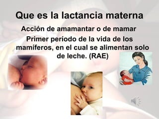 El documento habla sobre la lactancia materna. Define la lactancia materna como la acción de amamantar o de mamar, que es el primer período de la vida de los mamíferos en el cual se alimentan solo de leche. Explica que la leche humana está especialmente diseñada para cubrir todas las necesidades del bebé humano. Recomienda la alimentación exclusiva al pecho durante los primeros 6 meses y continuar amamantando junto con alimentos complementarios hasta los 2 años de edad o más.