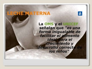 El documento describe los beneficios de la lactancia materna para el niño y la madre, incluyendo un mejor desarrollo, estado nutricional e inmunidad para el niño, y una recuperación más rápida del embarazo y vínculo para la madre. También explica el proceso de producción de leche, posiciones para amamantar, y consideraciones importantes para el apoyo de la lactancia materna como la presencia del bebé después del parto y la alimentación a demanda. Finalmente, menciona algunos problemas comunes y contraindicaciones para