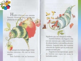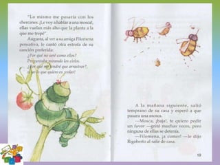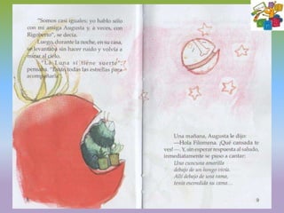 El documento trata sobre el cuento "Filomena y el alerce". En el cuento, Filomena quiere ir hasta el Sol, pero el alerce le explica que el Sol está muy lejos y que es peligroso, dejándola contenta con su explicación.
