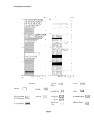 Este documento presenta una guía para analizar una sucesión sedimentaria encontrada en un perfil lacustre que contiene seis facies litológicas (A-F). Se pide describir cada facies, interpretar los procesos sedimentarios y ambientes representados, y analizar la evolución del lago a lo largo del tiempo relacionando los cambios en el nivel del lago y la sucesión de facies.