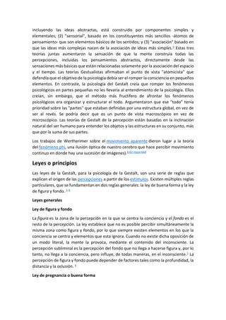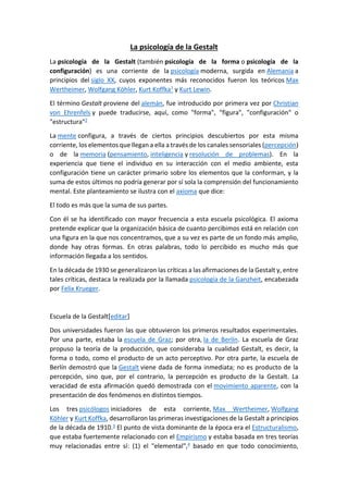 La psicología de la Gestalt surgió en Alemania a principios del siglo XX. Propone que la mente percibe las cosas como configuraciones globales (gestalts) más que como una suma de partes. Explica la percepción mediante "leyes", como la ley de buena forma que establece que la mente percibe las formas más simples y completas. El todo es más que la suma de sus partes.
