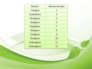 El documento habla sobre los vértices y lados de las figuras geométricas. Define el vértice como el punto común entre los lados consecutivos de una figura y los lados como rectas o líneas rectas que forman las figuras. Proporciona un ejemplo gráfico de un vértice y un lado.