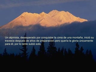 Un alpinista subió solo una montaña de noche para conquistar la cima y ganar gloria para sí mismo. Al estar cerca de la cima, resbaló y cayó colgando de su cuerda de seguridad. Escuchó una voz de Dios que le ofreció salvarlo si cortaba la cuerda, pero el alpinista se aferró a ella con miedo. A la mañana siguiente fue encontrado muerto, congelado y a solo dos metros del suelo, sin soltar la cuerda que lo sostenía.