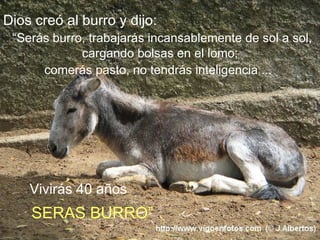 El documento describe cómo Dios creó diferentes animales y les asignó una vida útil específica - 40 años para el burro, 25 años para el perro y 20 años para el mono. Cuando Dios creó al hombre y le dijo que viviría 30 años, el hombre negoció para obtener los años de vida que los otros animales habían rechazado, resultando en que los hombres viven 30 años como humanos, 20 como burros trabajando, 10 como perros cuidando el hogar en la jubilación y 10 como monos divertidos con los nietos en la vejez.