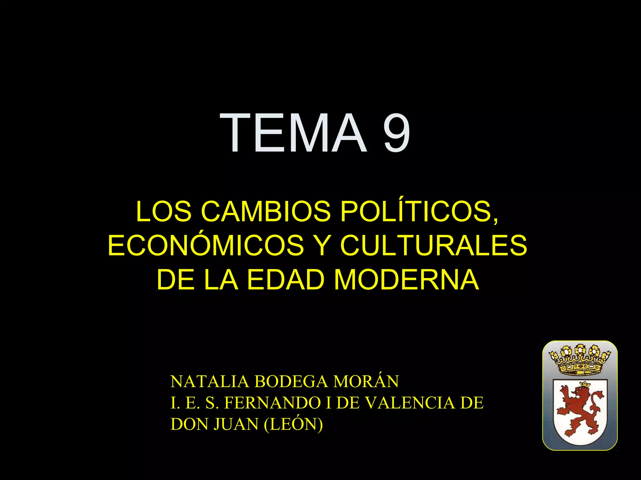 El documento resume los principales cambios políticos, económicos y culturales de la Edad Moderna en Europa, incluyendo la crisis del siglo XIV con la peste negra, el hambre y las guerras que redujeron la población europea en 25 millones; el surgimiento de los estados-nación y la monarquía autoritaria; y los logros políticos, militares y religiosos de los Reyes Católicos en España en el siglo XV.