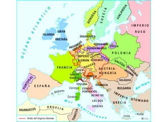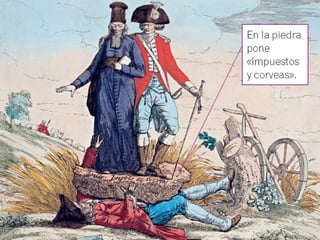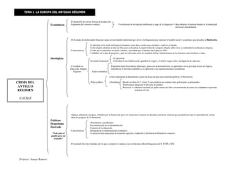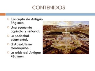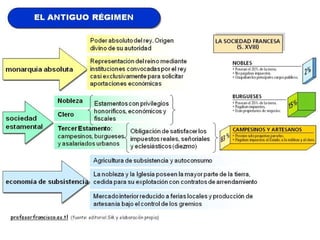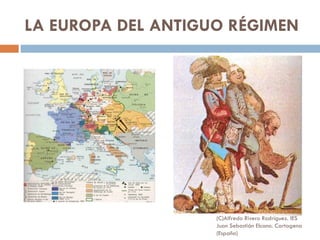 El documento resume la estructura económica, social y política de la Europa del Antiguo Régimen. La economía se basaba principalmente en la agricultura y la ganadería, mientras que la industria y el comercio crecían lentamente. La sociedad estaba estratificada y la monarquía era absoluta en la mayoría de países. En el siglo XVIII, la Ilustración criticó este sistema y promovió ideas liberales que cuestionaron el Antiguo Régimen. Cambios económicos y nuevas ideas políticas llevaron finalmente a su decl