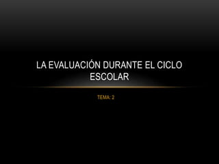 El documento habla sobre la evaluación durante el ciclo escolar con enfoque formativo. Explica que la evaluación debe buscar la permanencia del alumno en la escuela mediante la prevención y el apoyo al logro de los aprendizajes esperados. También debe valorar los procesos de enseñanza y aprendizaje, retroalimentar el aprendizaje y reflexionar la práctica docente. La planificación docente debe tomar en cuenta los ritmos de aprendizaje de los estudiantes y generar oportunidades de aprendizaje significativ