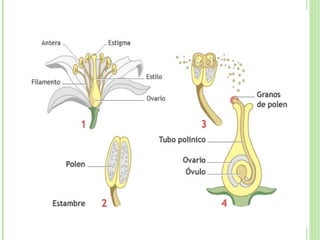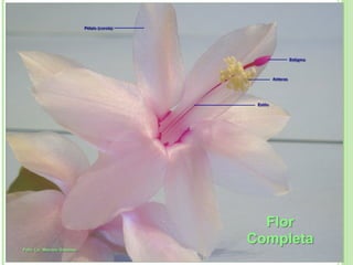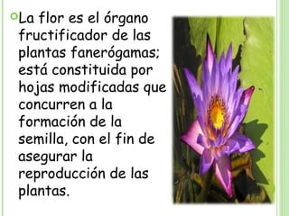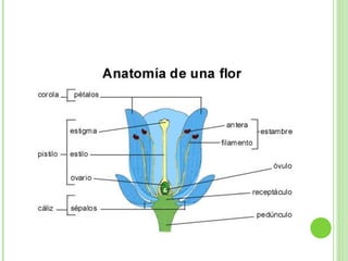 La flor es el órgano reproductor de las plantas fanerógamas. Está constituida por hojas modificadas que forman los verticilos florales (cáliz, corola, androceo y gineceo) para producir semillas. Las flores completas tienen los cuatro verticilos, mientras que las incompletas carecen de uno o más. El androceo contiene los estambres con anteras que producen polen, y el gineceo contiene el ovario, estilo y estigma donde se desarrollan los óvulos f