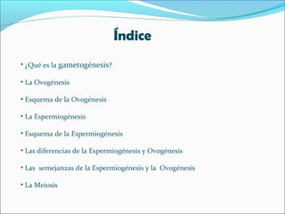 El documento describe los procesos de espermatogénesis y ovogénesis, que son las conversiones de células germinales en gametos masculinos y femeninos. La espermatogénesis ocurre en los testículos y produce espermatozoides a partir de espermatogonias, mientras que la ovogénesis ocurre en los ovarios y produce óvulos a partir de ovogonias. Ambos procesos involucran la meiosis, que reduce el número de cromosomas de las células germinales diploides a las células haploides de los gametos.