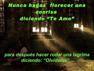 El documento habla sobre la importancia del amor y la amistad. Aconseja no engañar a otros diciendo que los amas para luego pedir que te olviden, porque eso causa lágrimas dolorosas. También enfatiza que los amigos verdaderos dejan huellas en el corazón y que la vida es un regalo que debe vivirse en el presente con una sonrisa. Finalmente, invita a demostrar a los amigos cuánto nos importan.