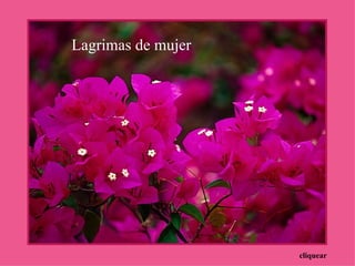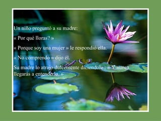 El documento habla sobre por qué lloran las mujeres. Un niño le pregunta a su madre y ella responde que es porque es una mujer, pero él no lo entiende. Más tarde le pregunta a su padre, quien dice que todas las mujeres lloran sin razón. De adulto le pregunta a Dios, quien explica que dio a las mujeres espaldas fuertes para soportar la carga del mundo pero también corazones sensibles. Dios les dio la capacidad de dar vida y aceptar el rechazo de sus hijos, así como la fuerza para continuar luch