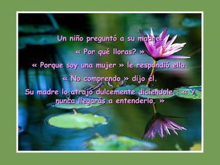 El documento trata sobre por qué lloran las mujeres. Un niño pregunta a su madre y padre sobre por qué llora su madre, pero ninguno puede darle una respuesta satisfactoria. Ya de adulto, el hombre le pregunta a Dios, quien le explica que las mujeres fueron hechas de manera especial con la capacidad de dar vida y soportar grandes cargas emocionales y físicas, por lo que se les dio la habilidad de llorar para expresar todo lo que sienten.