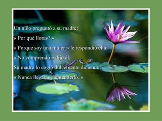 Un niño preguntóa su madre: « Por qué lloras? » « Porque soy una mujer » le respondió ella. « No comprendo » dijo él. Su madre lo cogió dulcemente diciendo: « Nunca llegarás a entenderlo. »