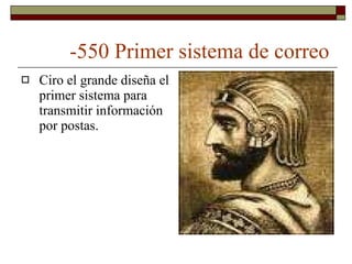 El documento resume brevemente la historia del desarrollo de Internet desde sus inicios, incluyendo el primer sistema de correo en el siglo I a.C., el desarrollo de los logaritmos y tarjetas perforadas en los siglos XVII-XVIII, la creación de las primeras computadoras electrónicas en la década de 1940, el establecimiento de ARPANET y el protocolo TCP/IP en las décadas de 1960-1970, el surgimiento de los navegadores web y motores de búsqueda en la década de 1990, y el des