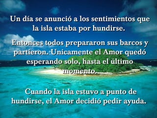 El Amor se quedó solo en una isla que se estaba hundiendo mientras los otros sentimientos huían en barcos. El Amor le pidió ayuda a la Riqueza, el Orgullo y la Tristeza, pero todos lo rechazaron. Finalmente, un viejo llamado Tiempo acogió al Amor en su barco y lo salvó porque, como dijo la Sabiduría, solo el Tiempo entiende la importancia del Amor.