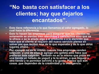 Este documento discute la importancia del valor agregado y la buena atención al cliente para las empresas. Explica que el valor agregado, como agregar una galleta a un salpicón, hace que los clientes se sientan más que satisfechos y quieran volver. Además, argumenta que la atención al cliente es más valorada que solo el producto. Finalmente, señala que los grandes supermercados son preferidos debido a su buen servicio, instalaciones e variedad que genera confianza al comprar.