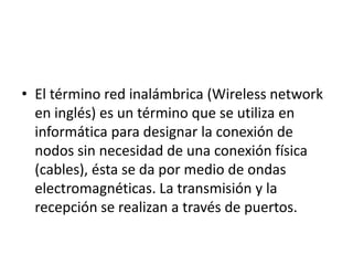 Este documento describe tres tipos principales de redes inalámbricas: WPAN, que son redes personales de corto alcance; WMAN, que son redes metropolitanas; y WWAN, que son redes de área amplia que usan tecnologías celulares. Explica algunas tecnologías clave como HomeRF, WiMAX y Wi-Fi que permiten la conectividad inalámbrica entre dispositivos dentro y más allá del hogar y la oficina.