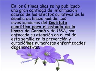 La semilla de linaza tiene propiedades curativas para numerosas enfermedades como el cáncer, la obesidad, problemas digestivos y cardiovasculares. Investigaciones demuestran que reduce riesgos de cáncer, controla el peso, previene enfermedades del colon y regulan el colesterol. También ayuda con problemas nerviosos, inmunológicos, inflamatorios, retención de líquidos, sexuales, de la piel y cabello, y diabetes. Mejora la vitalidad física y la energía celular. Se recom