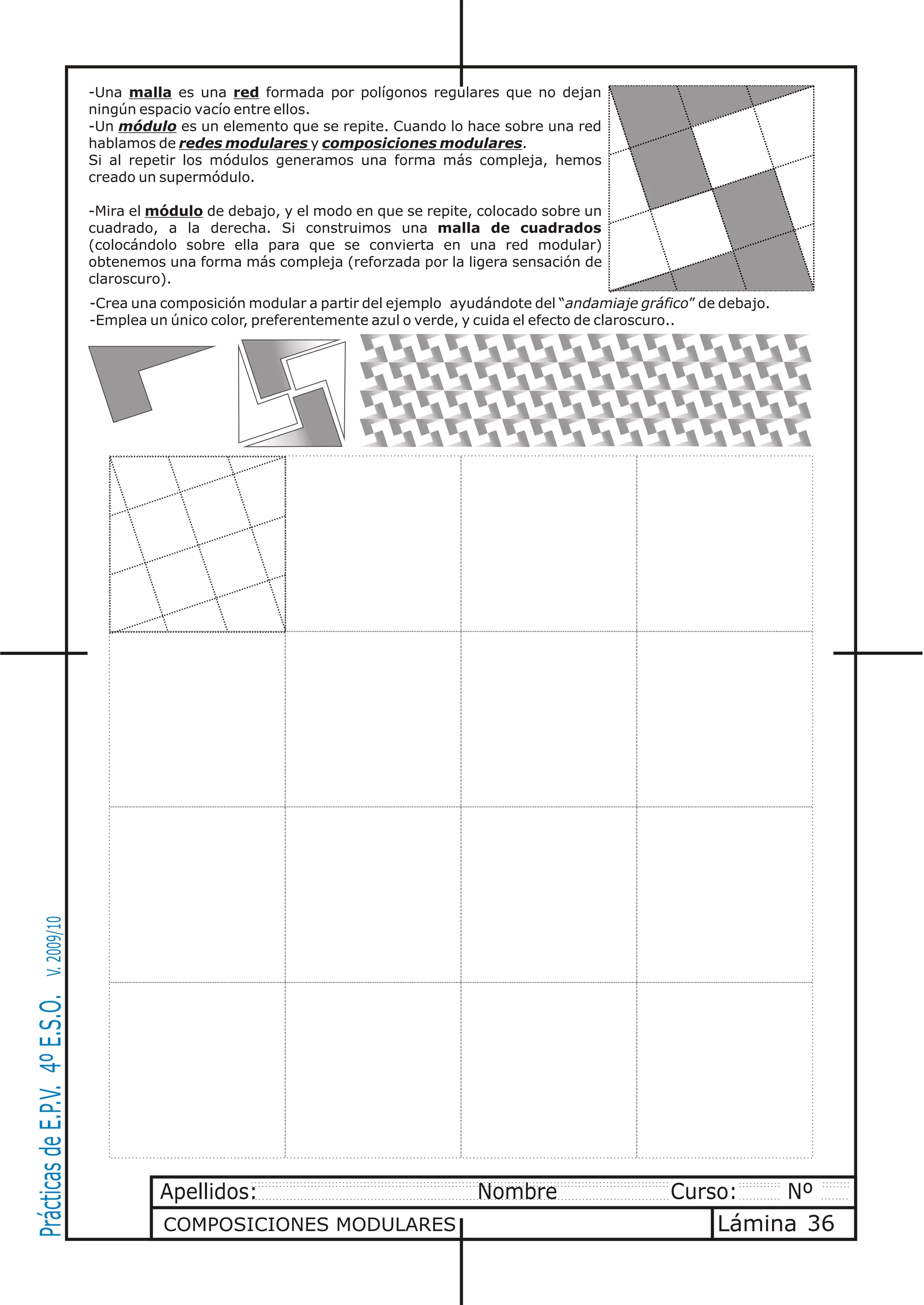 El documento describe las mallas, módulos y composiciones modulares. Una malla es una red formada por polígonos regulares sin espacios vacíos. Un módulo es un elemento que se repite para formar redes modulares y supermódulos más complejos cuando se combinan. El ejemplo muestra un módulo que se repite en una cuadrícula para crear una forma más grande.