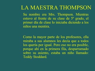 La historia narra la transformación de la maestra Thompson respecto a uno de sus alumnos, Teddy Stoddard. Al principio lo menospreciaba por su apariencia descuidada y problemas familiares, pero al revisar su expediente escolar y recibir un regalo de su parte comprendió su situación. Decidió apoyarlo especialmente y Teddy respondió convirtiéndose en uno de los mejores alumnos. Años después Teddy se recibió de médico y le pidió a Thompson que lo acompañara en su boda en lugar de su madre fallecida